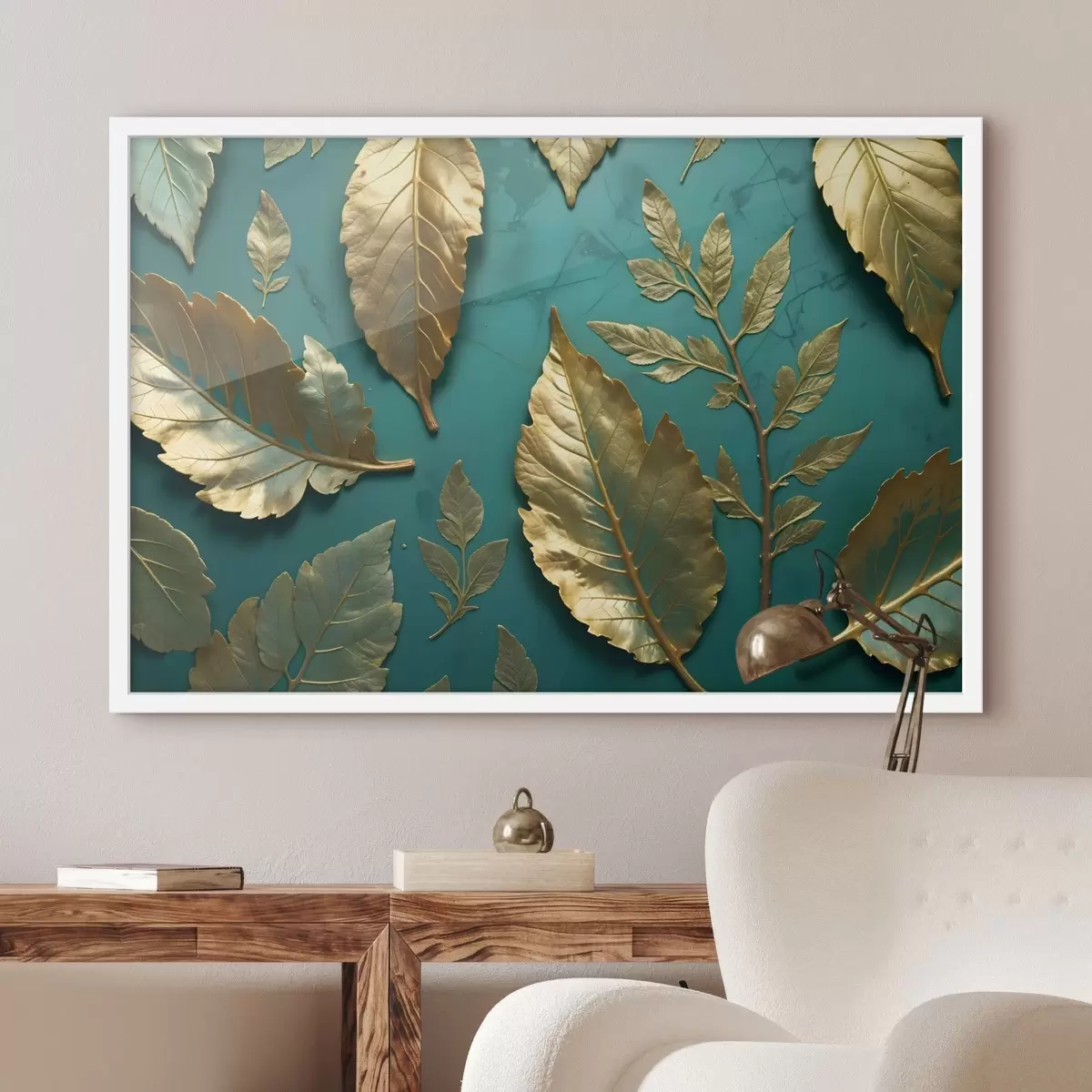 Plakatas Geltoni subtilūs lapai ant arbatinės spalvos fono, sukuriantys elegantišką botaninį atspaudą f41727