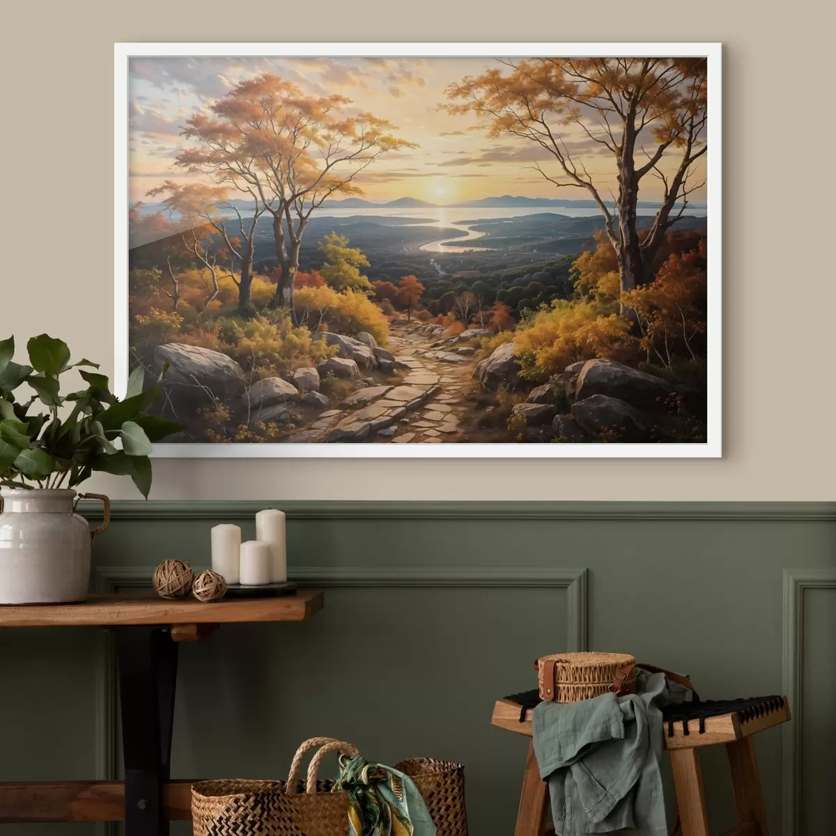 Plakatas Kraštovaizdis su vingiuojančiu purvinu keliu, vedančiu per rudens spalvos medžių mišką ir saulėlydžio dangų Ne f41732