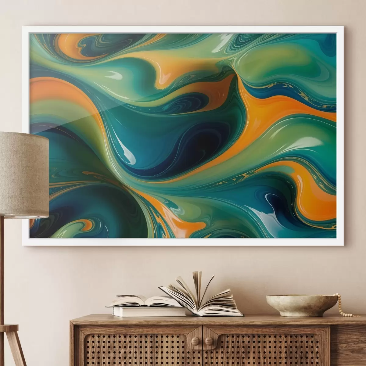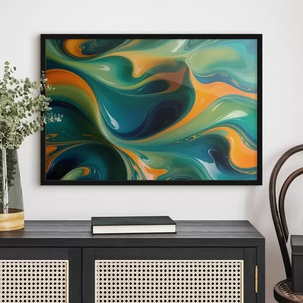 Plakatas Žalių, mėlynų ir oranžinių atspalvių sūkuriuojantys abstraktūs raštai, organiškos formos ir tekstūros f41737