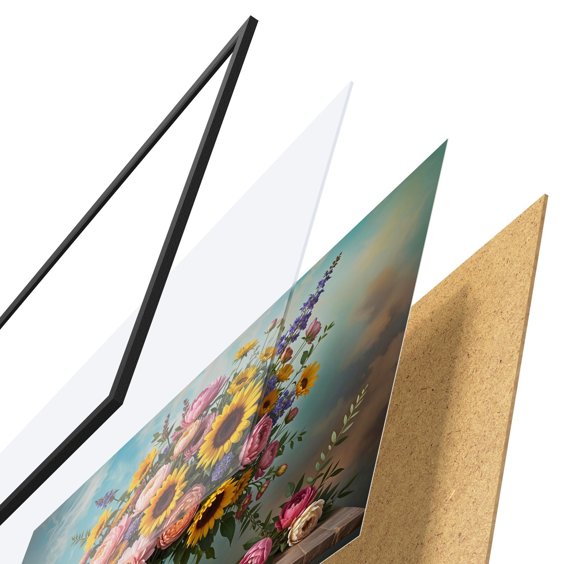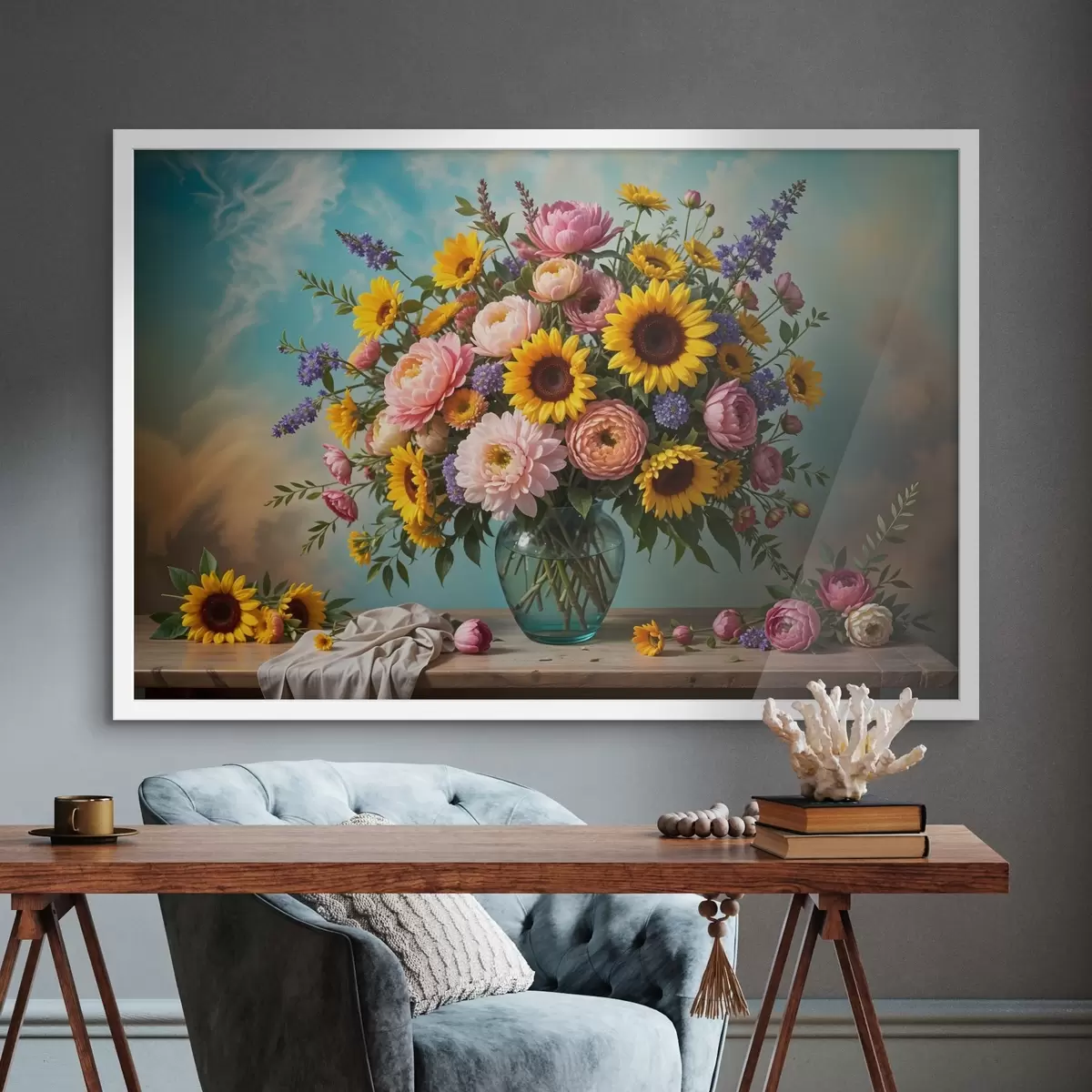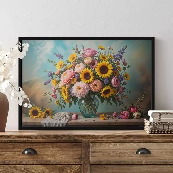 Plakatas Didelė puokštė spalvingų gėlių, įskaitant saulėgrąžas, bijūnus, margučius ir levandas, stiklinėje vazoje f41738