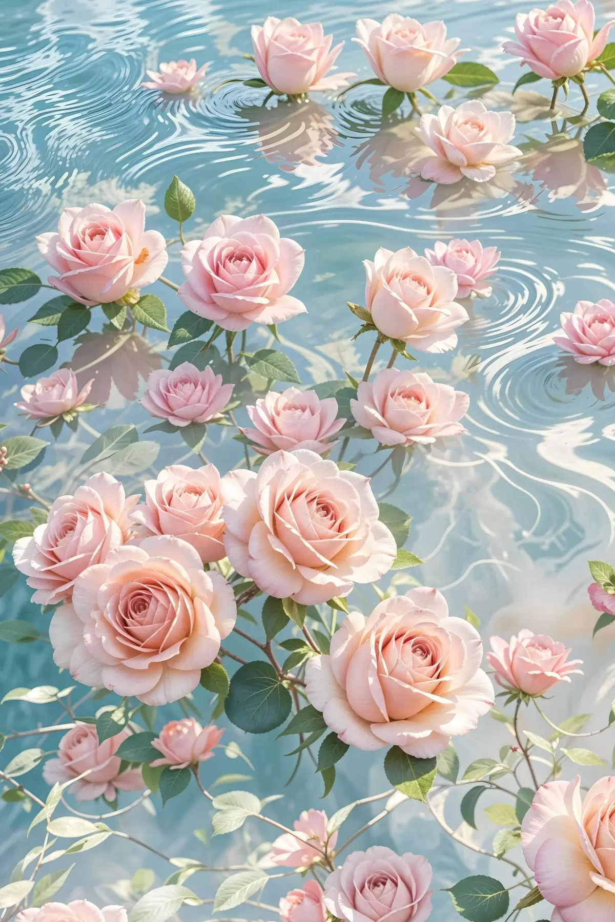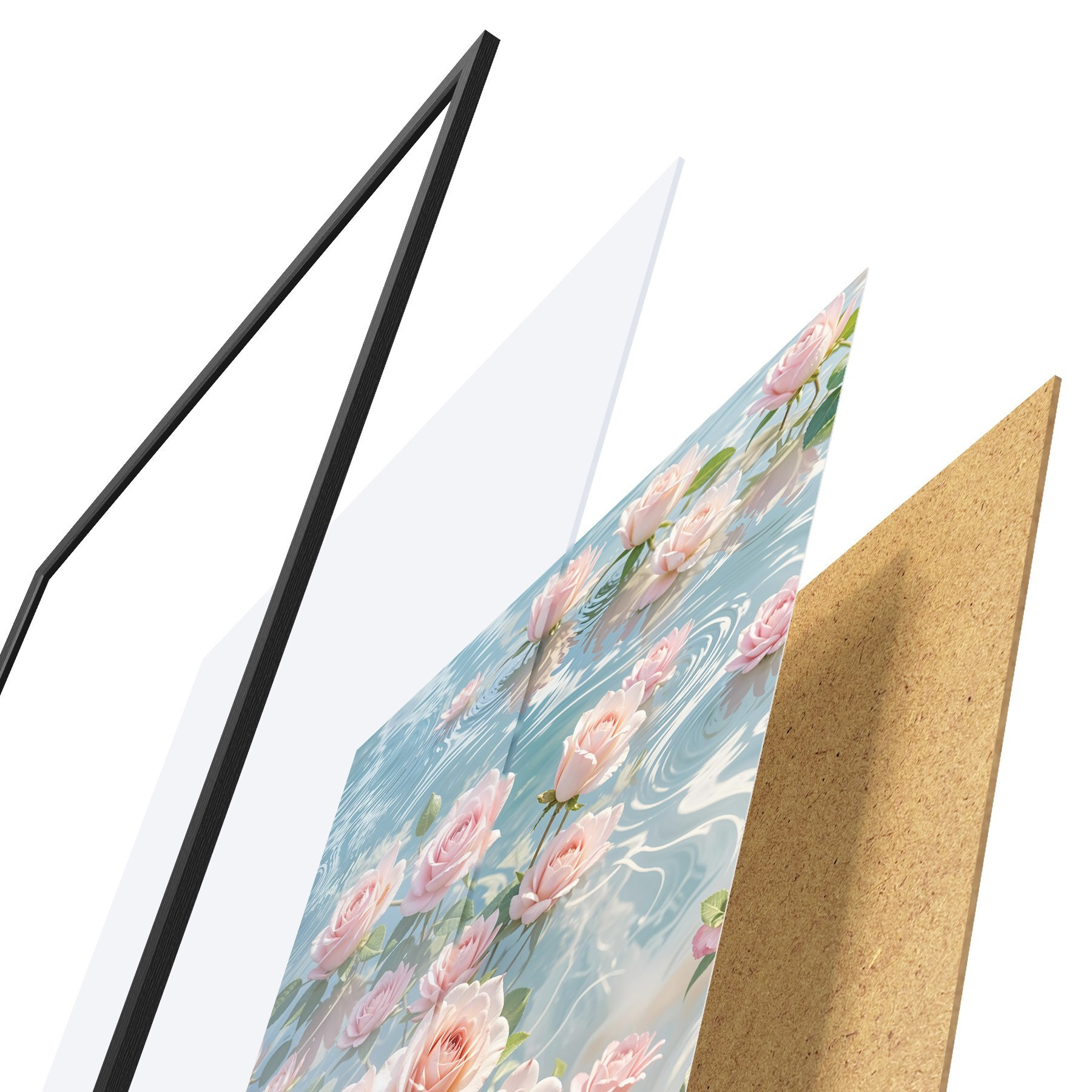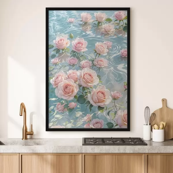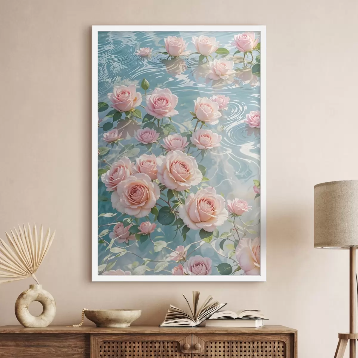 Plakatas Švelnios rausvos rožės, plaukiojančios ant ramaus tvenkinio su banguojančiu vandeniu, apsuptos vešlios žalumos f41742