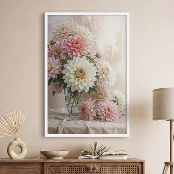 Plakatas Didelių rausvų ir baltų jurginų gėlių puokštė stiklinėje vazoje švelniai rausvame fone Ne f41743