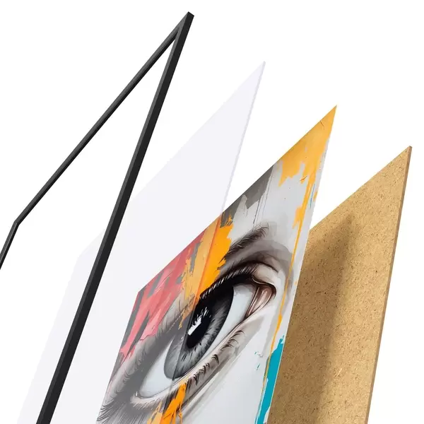 Plakatą sudaro rėmas, pleksiklas, atspausdintas vaizdas ir medžio drožlių plokštės pagrindas. Plakatą galima iš karto pakabinti ant sienos dėl kitoje pusėje esančių laikiklių.