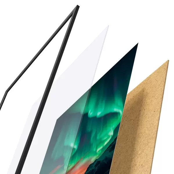 Plakatą sudaro rėmas, pleksiklas, atspausdintas vaizdas ir medžio drožlių plokštės pagrindas. Plakatą galima iš karto pakabinti ant sienos dėl kitoje pusėje esančių laikiklių.