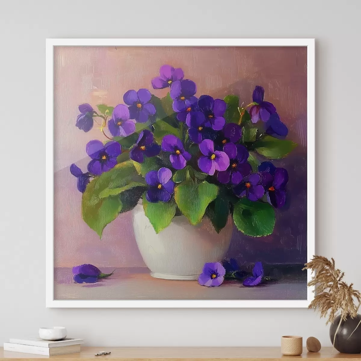Plakatas Violetinės vijoklinės gėlės baltame vazone f41823