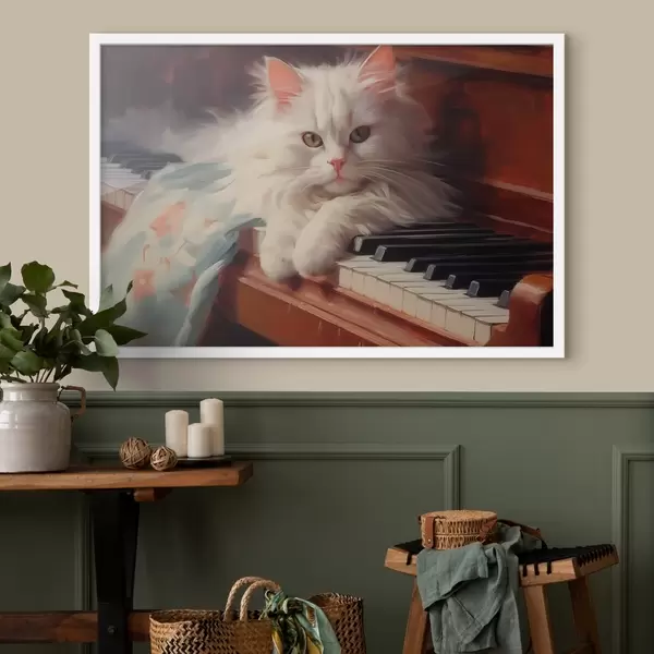 Plakatas Balta katė guli ant fortepijono klavišų imitacijos tapyba f41853