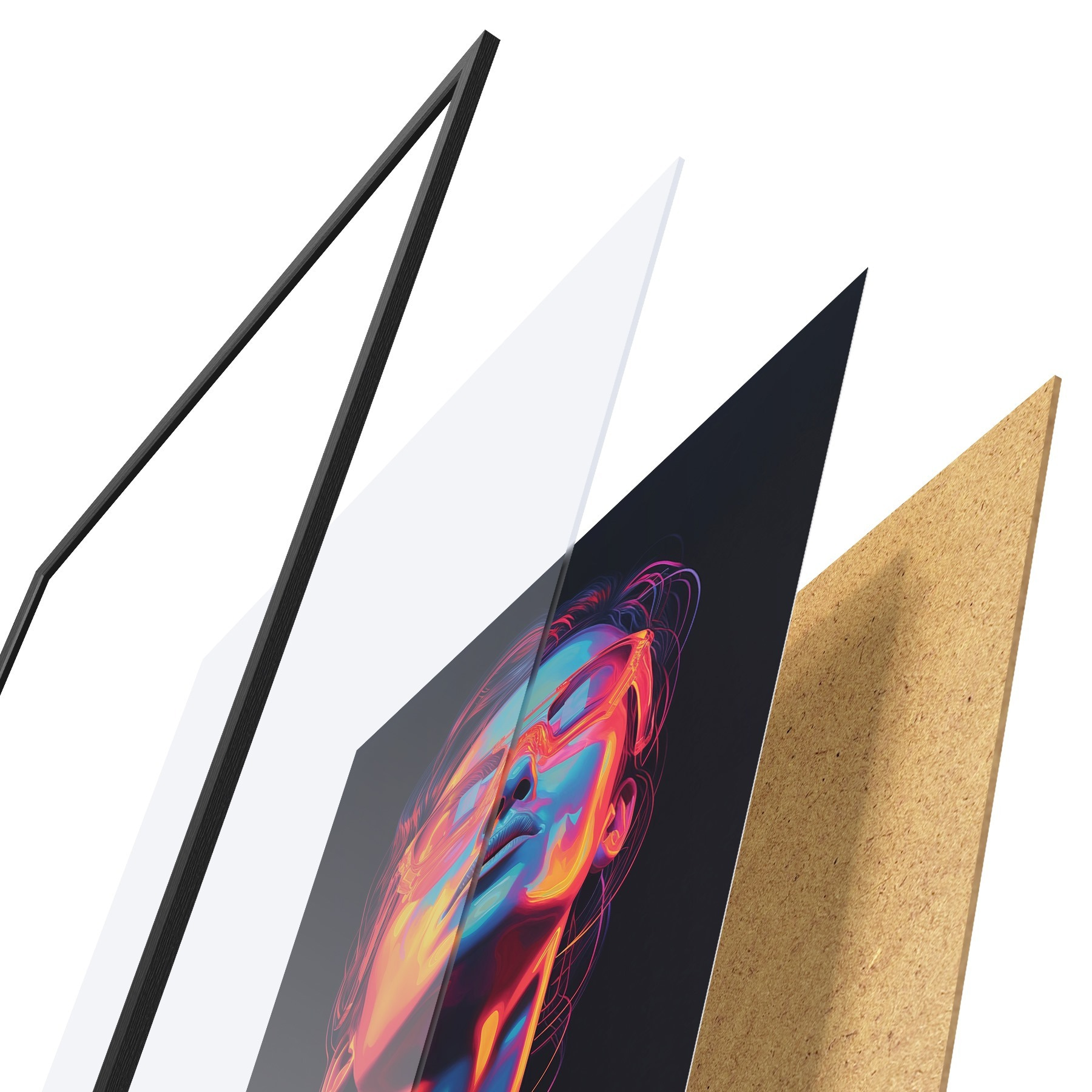 Plakatą sudaro rėmas, pleksiklas, atspausdintas vaizdas ir medžio drožlių plokštės pagrindas. Plakatą galima iš karto pakabinti ant sienos dėl kitoje pusėje esančių laikiklių.