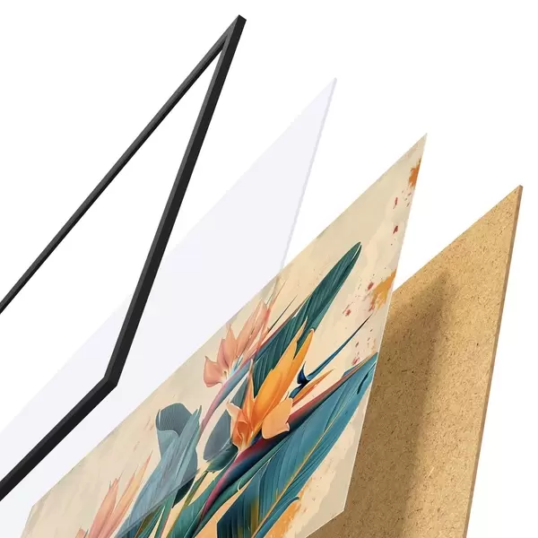 Plakatą sudaro rėmas, pleksiklas, atspausdintas vaizdas ir medžio drožlių plokštės pagrindas. Plakatą galima iš karto pakabinti ant sienos dėl kitoje pusėje esančių laikiklių.