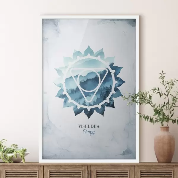 Plakatas Višudha čakra, mėlyna čakra, ezoterinis, meditacija, budizmas, akvarelės stiliaus kalnai Ne f41884