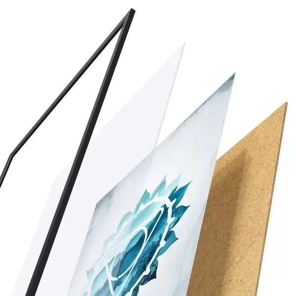 Plakatą sudaro rėmas, pleksiklas, atspausdintas vaizdas ir medžio drožlių plokštės pagrindas. Plakatą galima iš karto pakabinti ant sienos dėl kitoje pusėje esančių laikiklių.