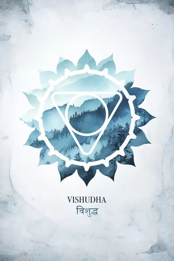 Plakatas Višudha čakra, mėlyna čakra, ezoterinis, meditacija, budizmas, akvarelės stiliaus kalnai f41884