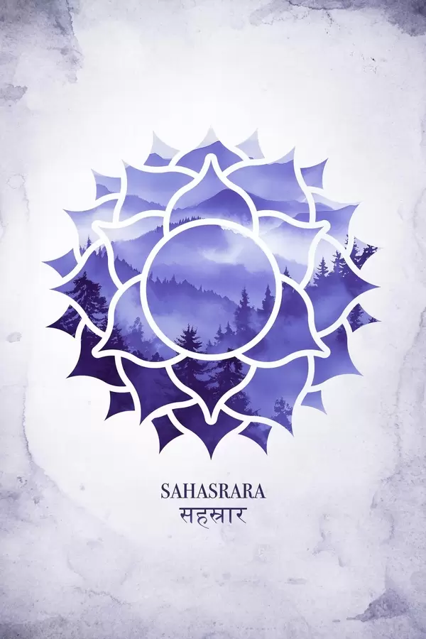 Plakatas Sahasrara čakra, violetinė čakra, ezoterinis, meditacija, budizmas, akvarelės stiliaus kalnai f41886