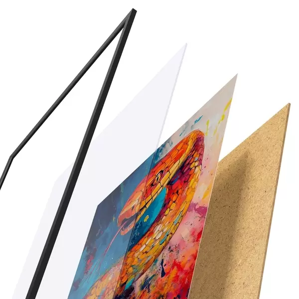 Plakatą sudaro rėmas, pleksiklas, atspausdintas vaizdas ir medžio drožlių plokštės pagrindas. Plakatą galima iš karto pakabinti ant sienos dėl kitoje pusėje esančių laikiklių.