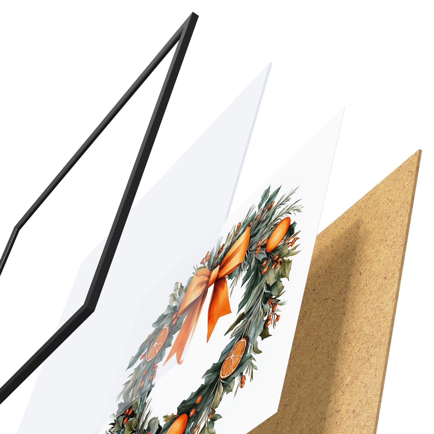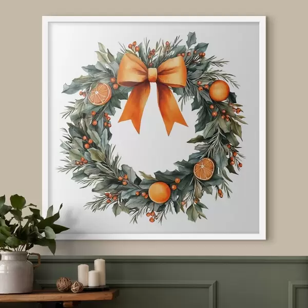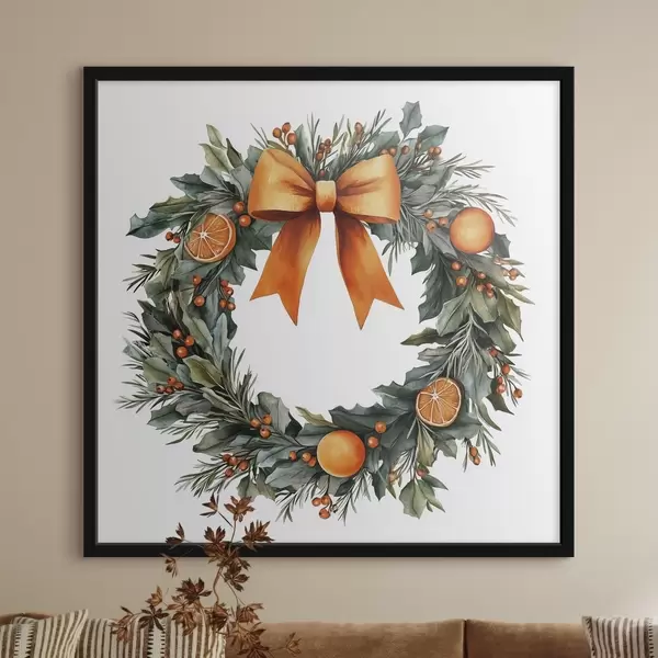 Plakatas Gražus šventinis vainikas su pušimis, apelsinais, uogomis ir lanku f41955