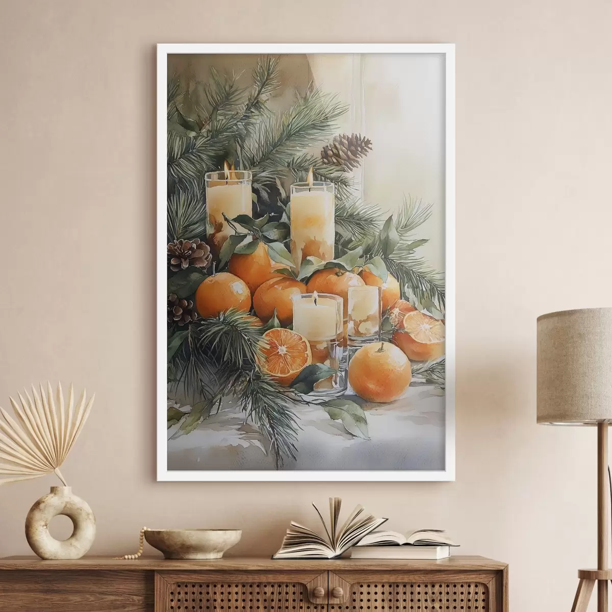 Plakatas Pušies šakos su spurgomis, apelsinais ir žvakėmis, šventinis, akvarelės stilius f41956