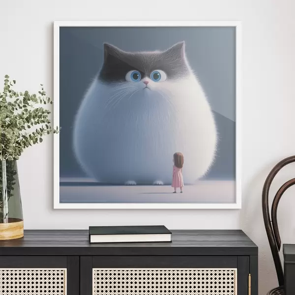 Plakatas Iliustracijų stiliaus nustebęs pūkuotas katinas su mergaite f41974