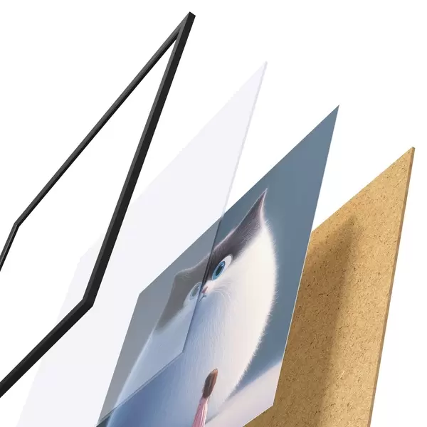 Plakatą sudaro rėmas, pleksiklas, atspausdintas vaizdas ir medžio drožlių plokštės pagrindas. Plakatą galima iš karto pakabinti ant sienos dėl kitoje pusėje esančių laikiklių.