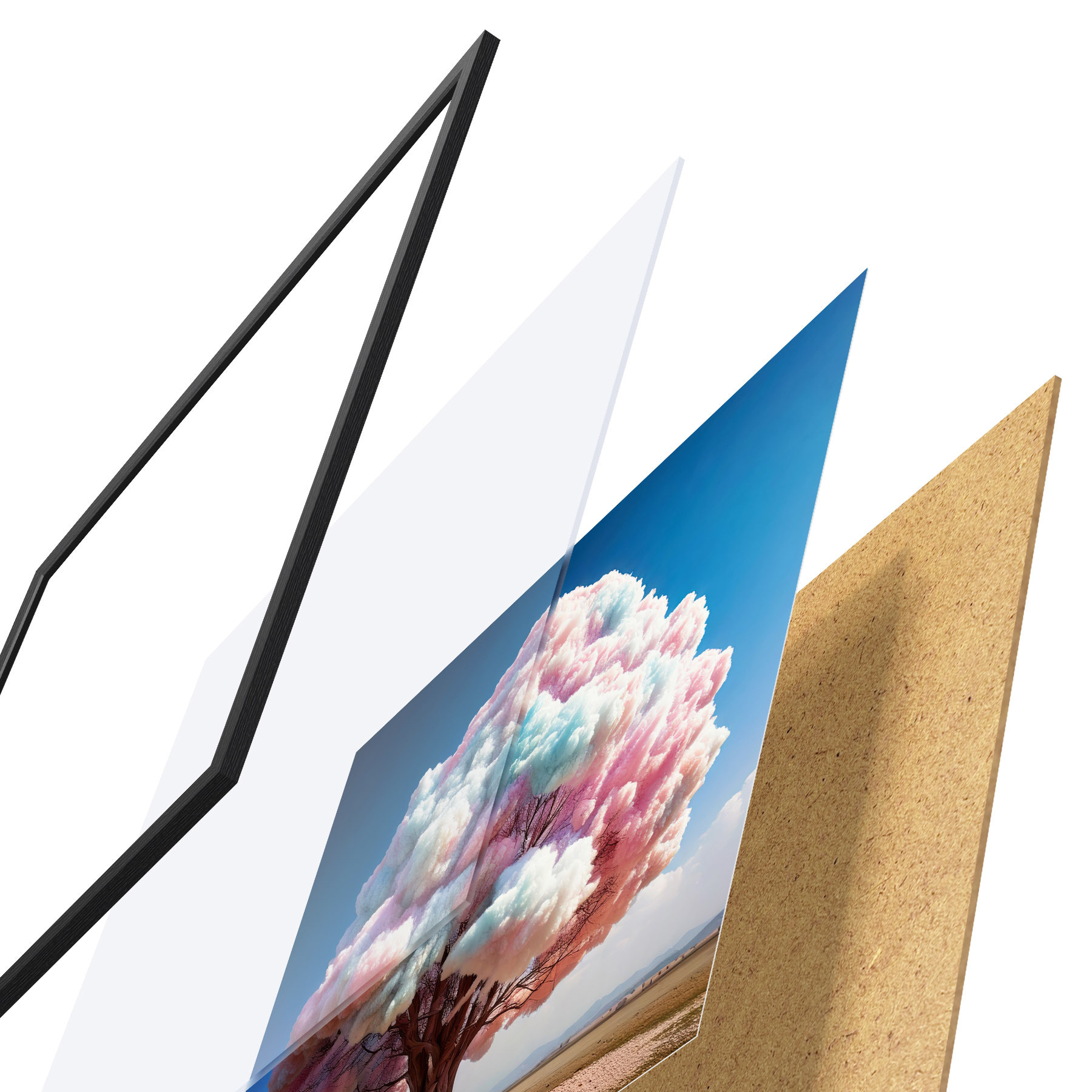 Plakatą sudaro rėmas, pleksiklas, atspausdintas vaizdas ir medžio drožlių plokštės pagrindas. Plakatą galima iš karto pakabinti ant sienos dėl kitoje pusėje esančių laikiklių.