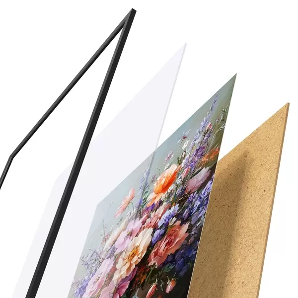Plakatą sudaro rėmas, pleksiklas, atspausdintas vaizdas ir medžio drožlių plokštės pagrindas. Plakatą galima iš karto pakabinti ant sienos dėl kitoje pusėje esančių laikiklių.