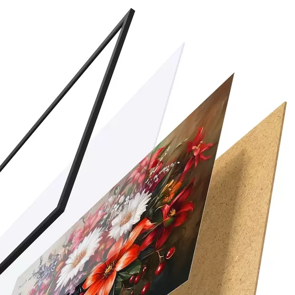 Plakatą sudaro rėmas, pleksiklas, atspausdintas vaizdas ir medžio drožlių plokštės pagrindas. Plakatą galima iš karto pakabinti ant sienos dėl kitoje pusėje esančių laikiklių.