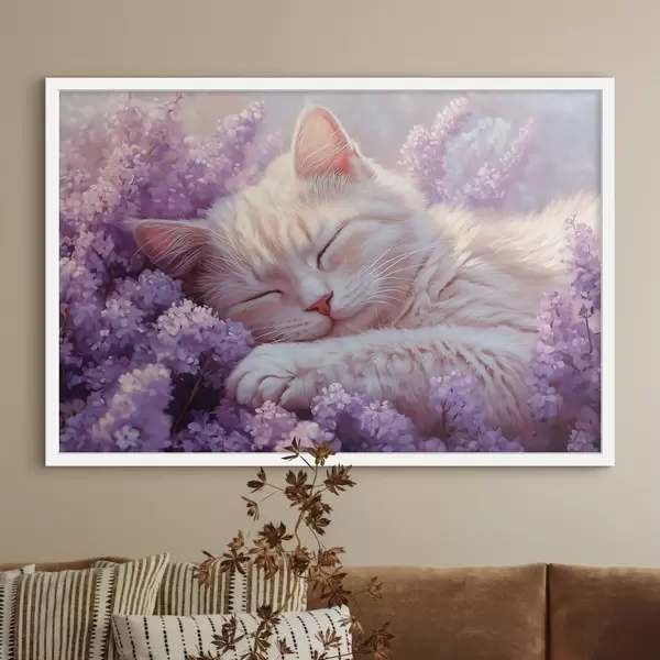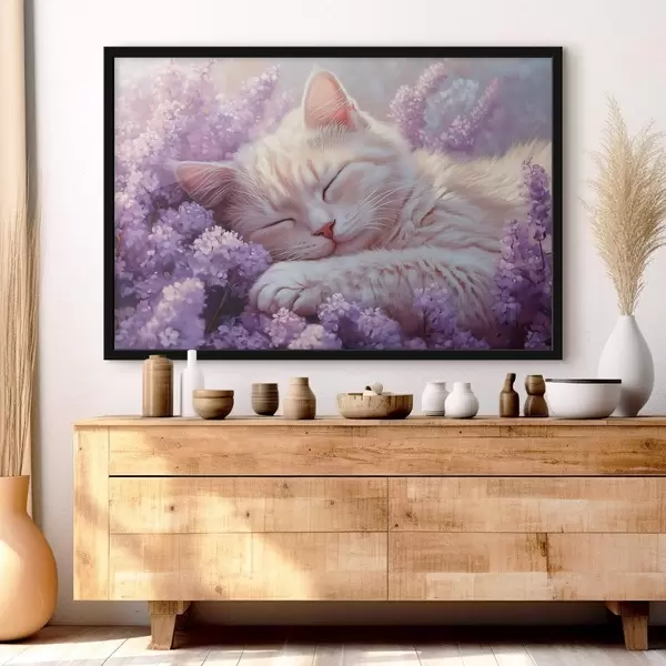 Plakatas katė guli ant violetinių gėlių Ne f42012