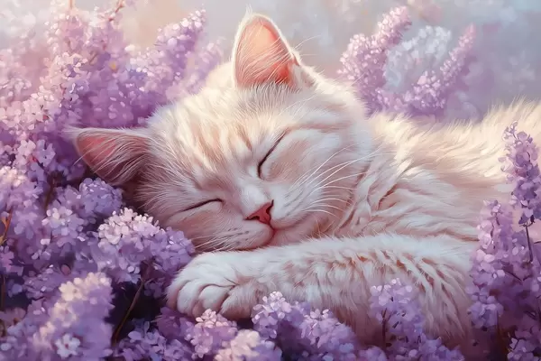 Plakatas katė guli ant violetinių gėlių Ne f42012