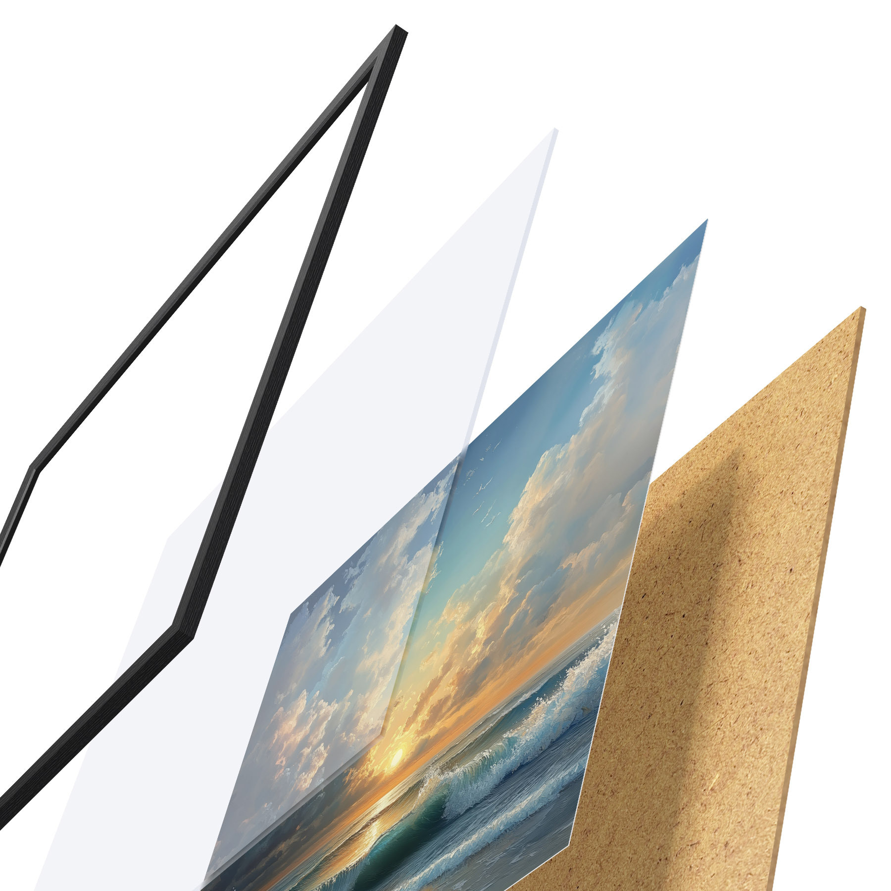 Plakatą sudaro rėmas, pleksiklas, atspausdintas vaizdas ir medžio drožlių plokštės pagrindas. Plakatą galima iš karto pakabinti ant sienos dėl kitoje pusėje esančių laikiklių.