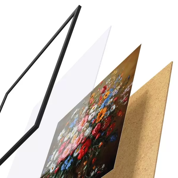 Plakatą sudaro rėmas, pleksiklas, atspausdintas vaizdas ir medžio drožlių plokštės pagrindas. Plakatą galima iš karto pakabinti ant sienos dėl kitoje pusėje esančių laikiklių.
