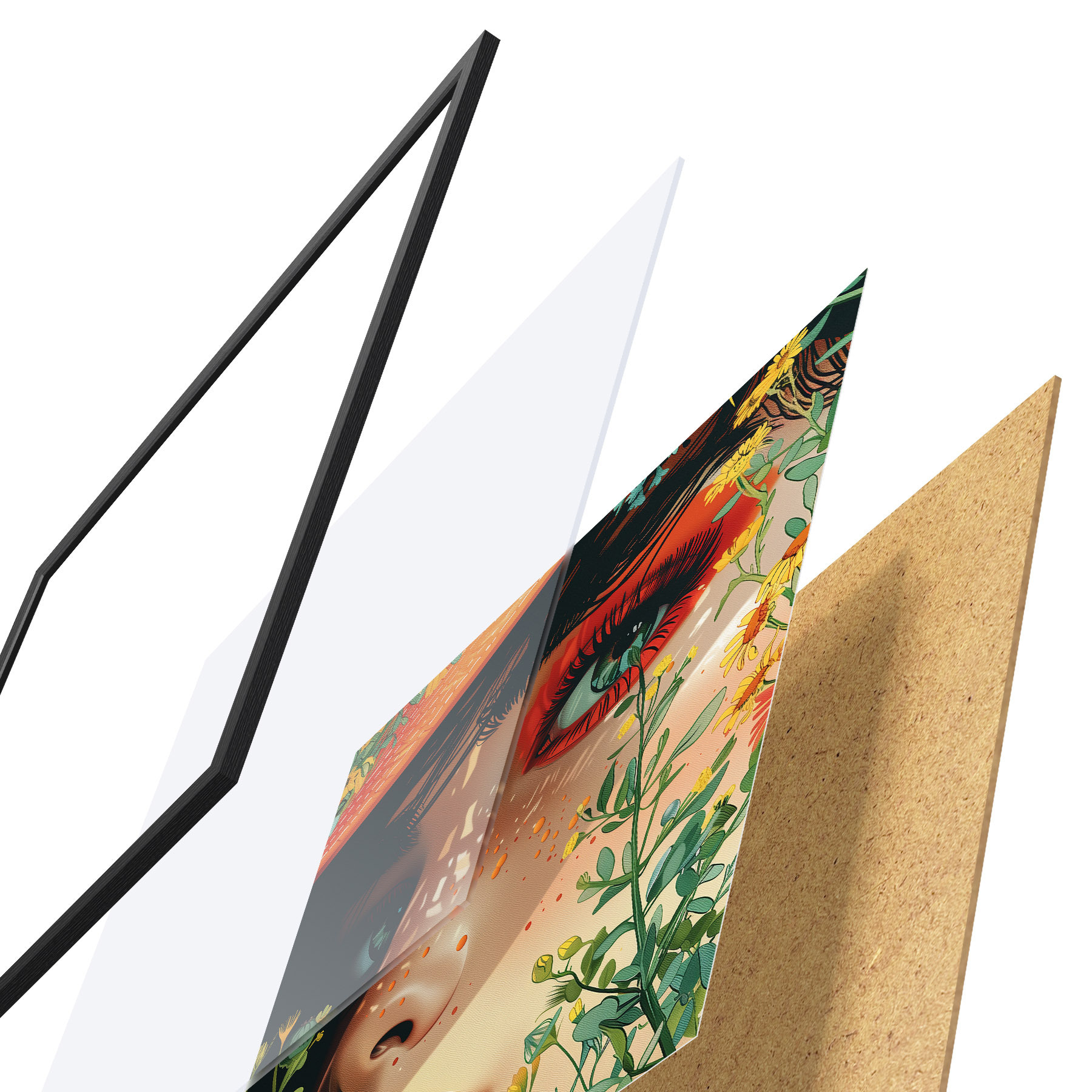 Plakatą sudaro rėmas, pleksiklas, atspausdintas vaizdas ir medžio drožlių plokštės pagrindas. Plakatą galima iš karto pakabinti ant sienos dėl kitoje pusėje esančių laikiklių.