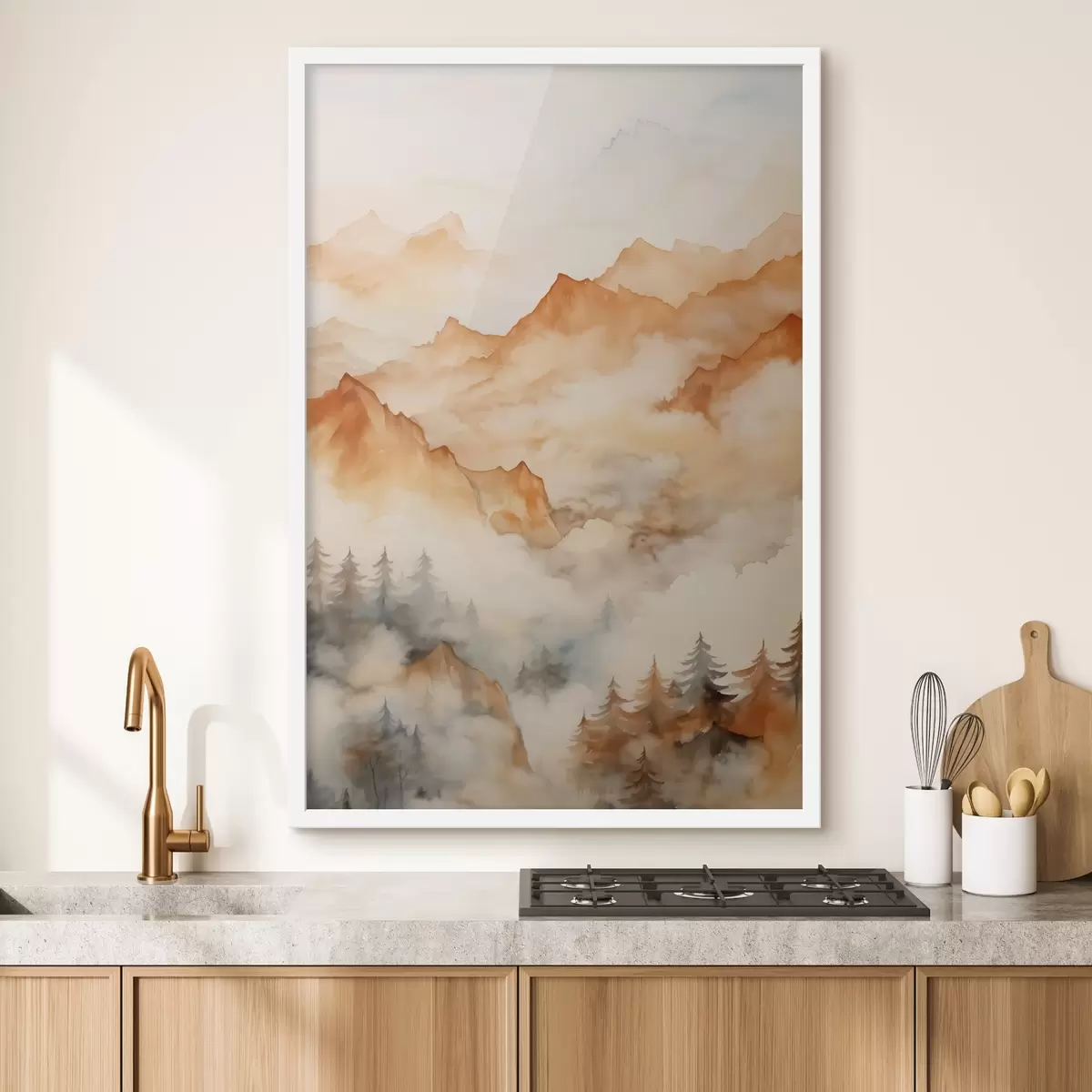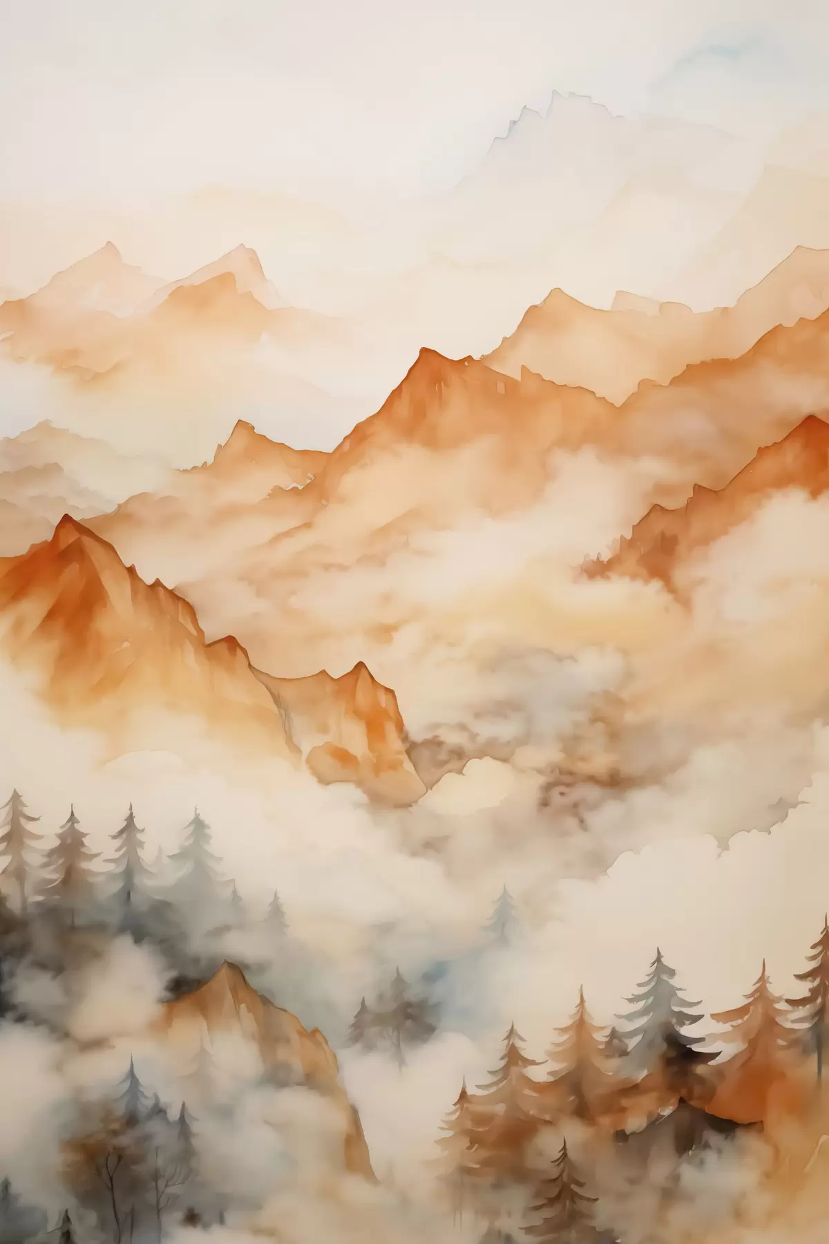 Plakatas Akvarelės imitacija, miškas ir kalnai, oranžiniai atspalviai f42119