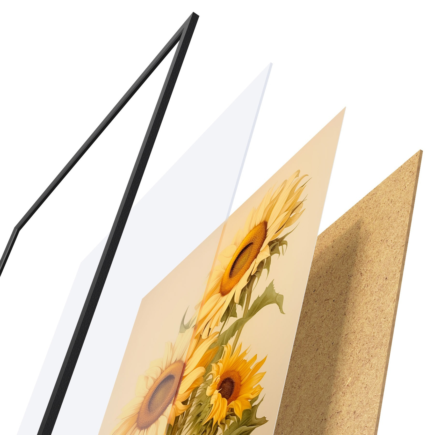 Plakatą sudaro rėmas, pleksiklas, atspausdintas vaizdas ir medžio drožlių plokštės pagrindas. Plakatą galima iš karto pakabinti ant sienos dėl kitoje pusėje esančių laikiklių.