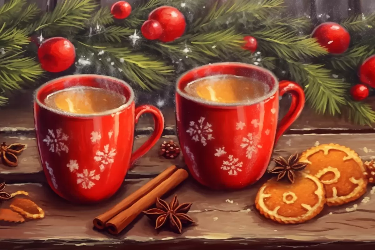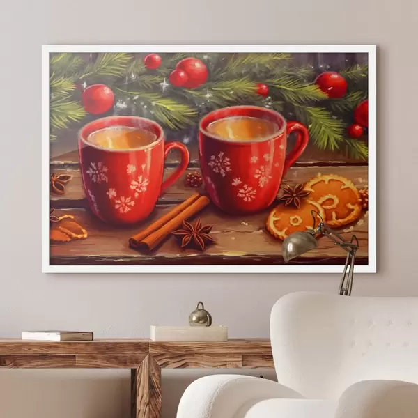 Plakatas Arbatos puodeliai tarp šventinių šakų f42164