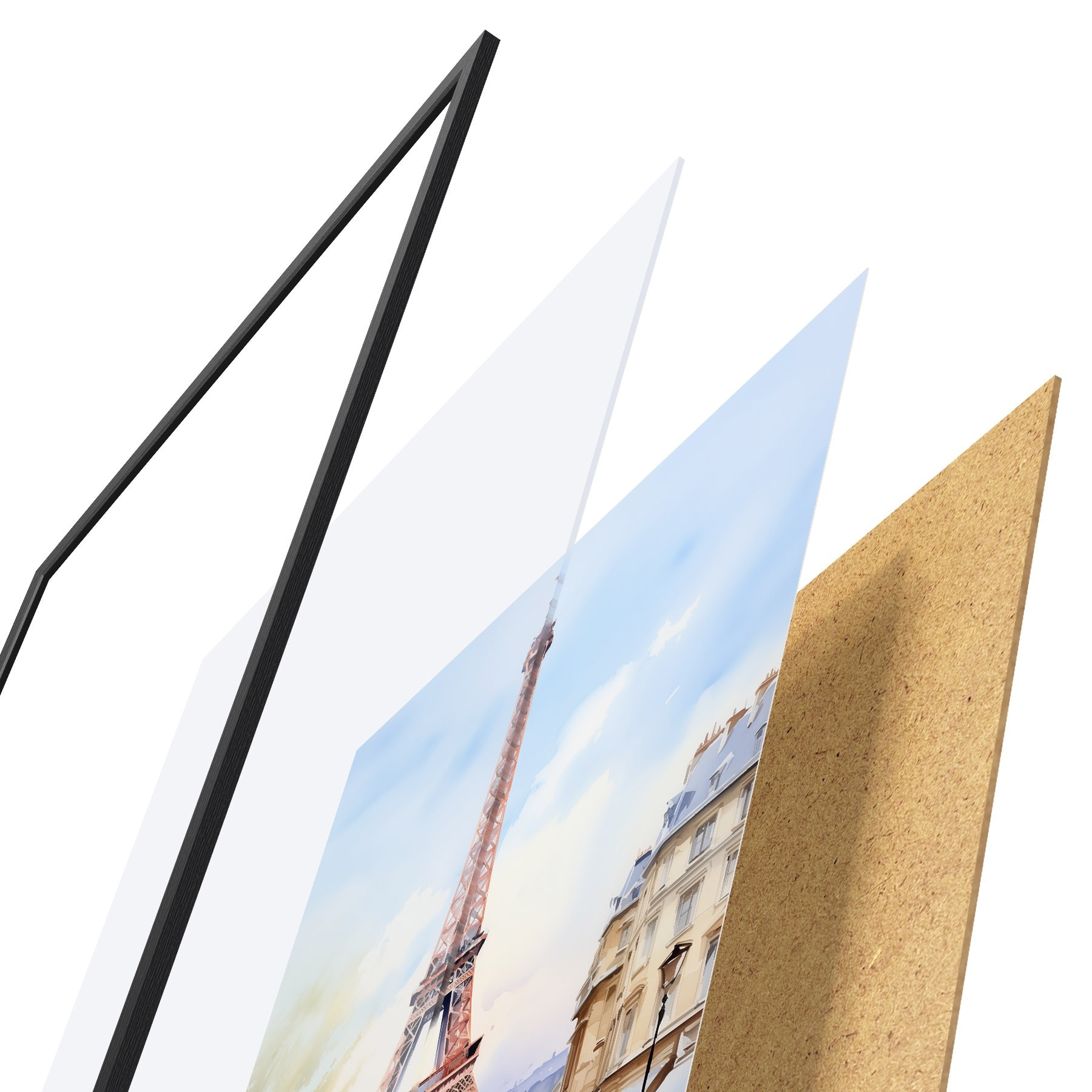 Plakatą sudaro rėmas, pleksiklas, atspausdintas vaizdas ir medžio drožlių plokštės pagrindas. Plakatą galima iš karto pakabinti ant sienos dėl kitoje pusėje esančių laikiklių.