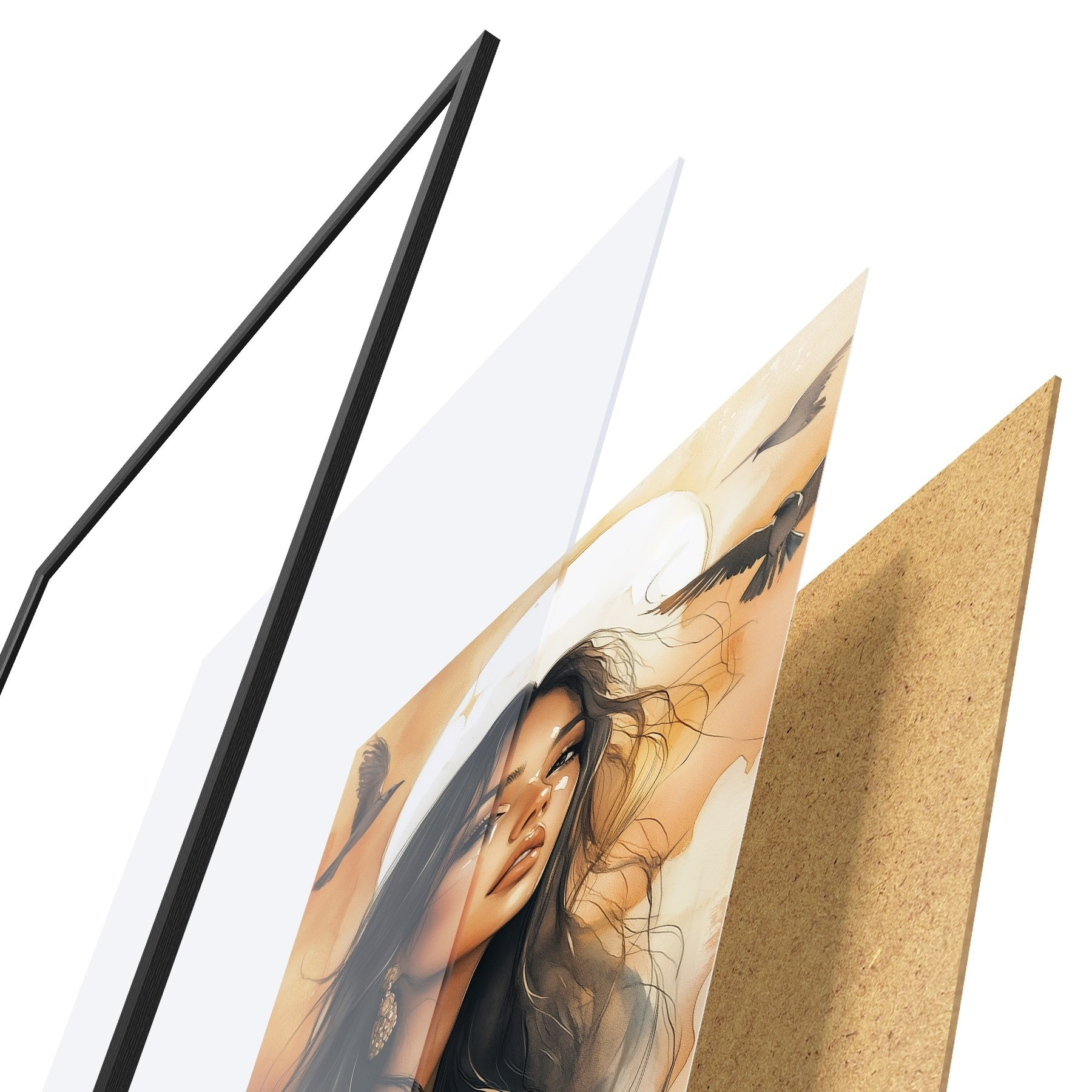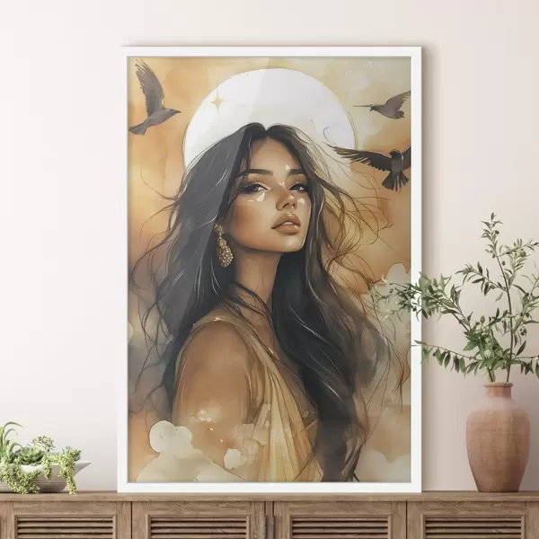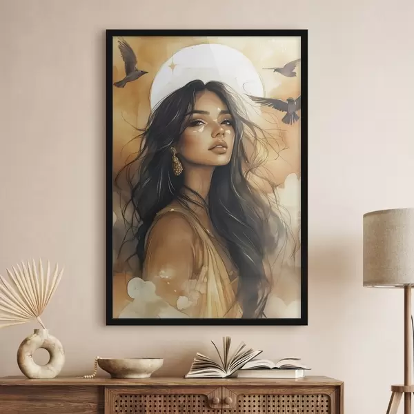 Plakatas Moteris su skraidančiais paukščiais, genties, smėlio spalvos, saulė Ne f42196