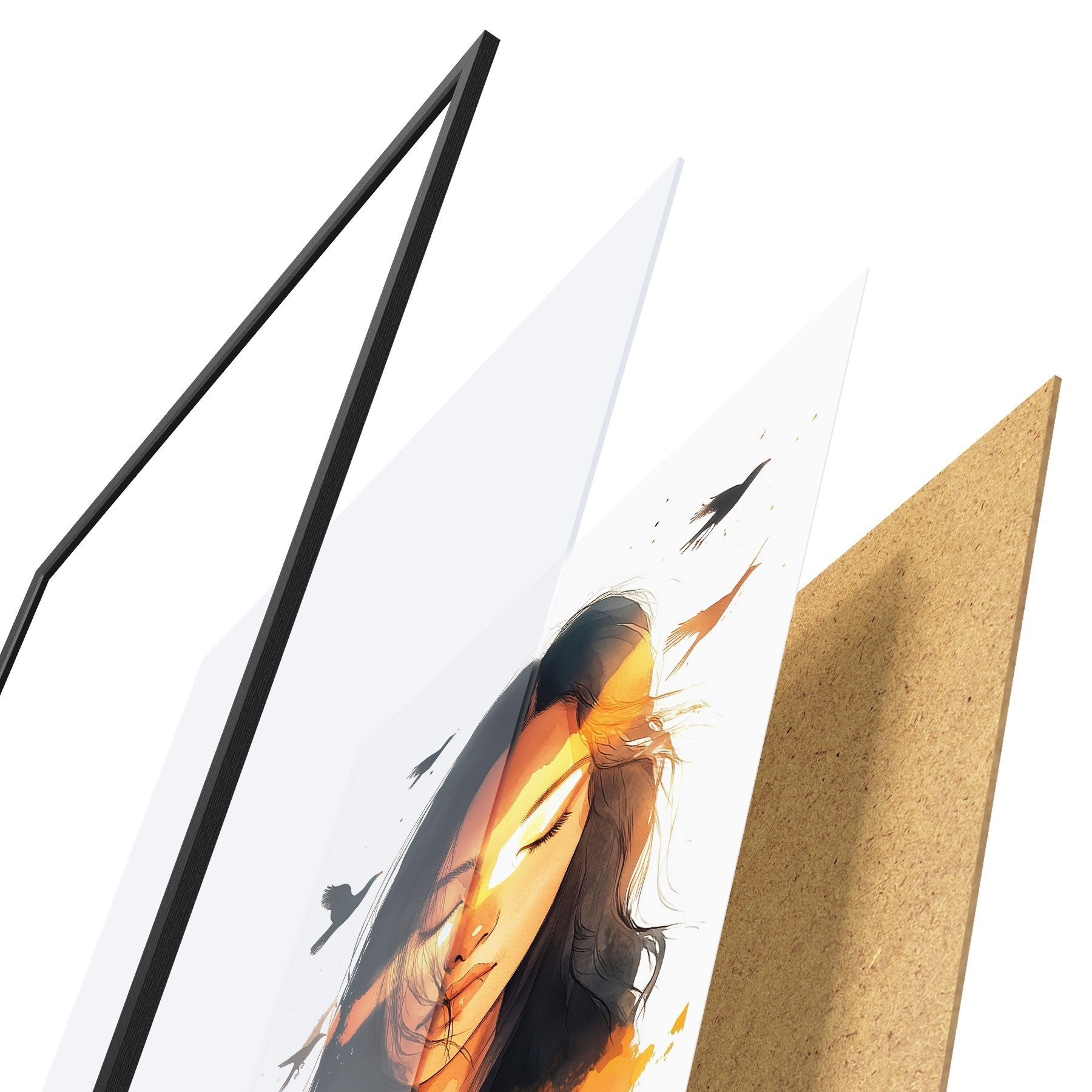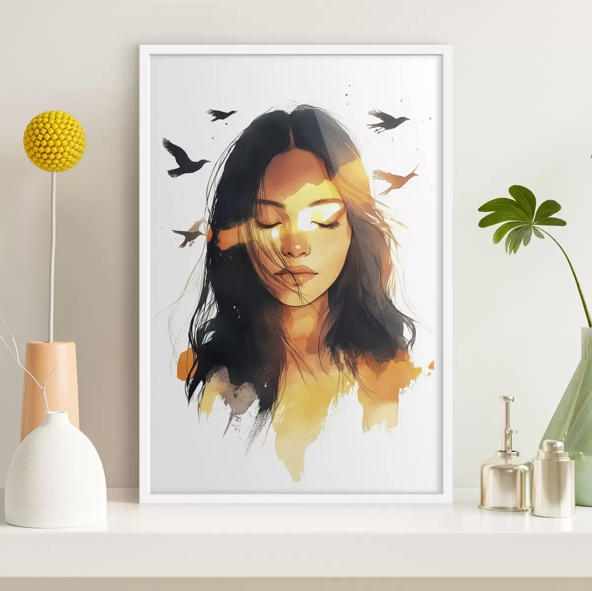 Plakatas Akvarelės stiliaus portretas, graži mergaitė, saulės šviesa, skraidantys paukščiai Ne f42198