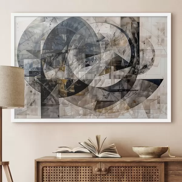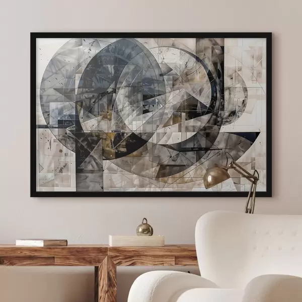 Plakatas Abstrakti šiuolaikinė geometrinė kompozicija su persidengiančiomis formomis ir pilkų, juodų ir smėlio atspalvių spauda f42212
