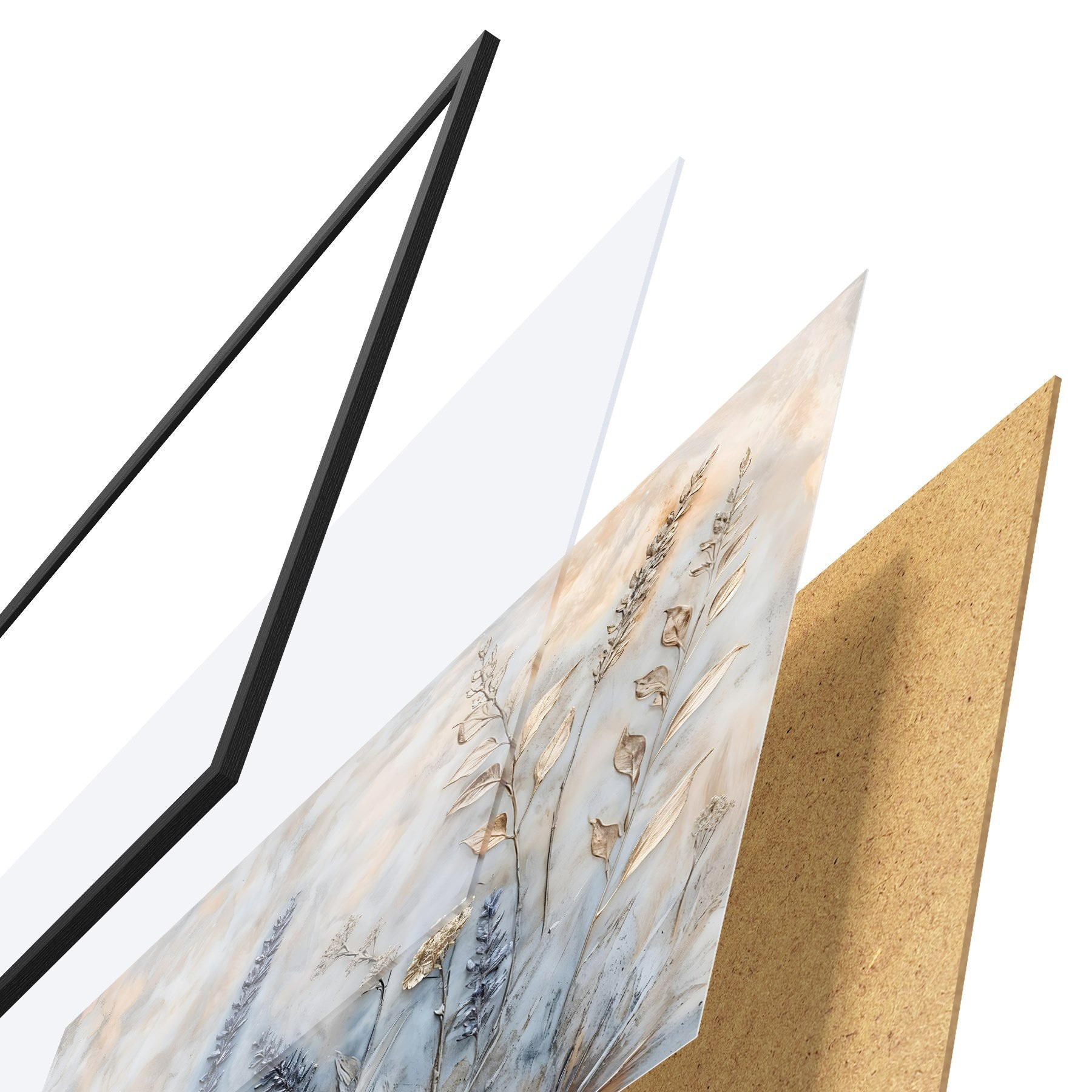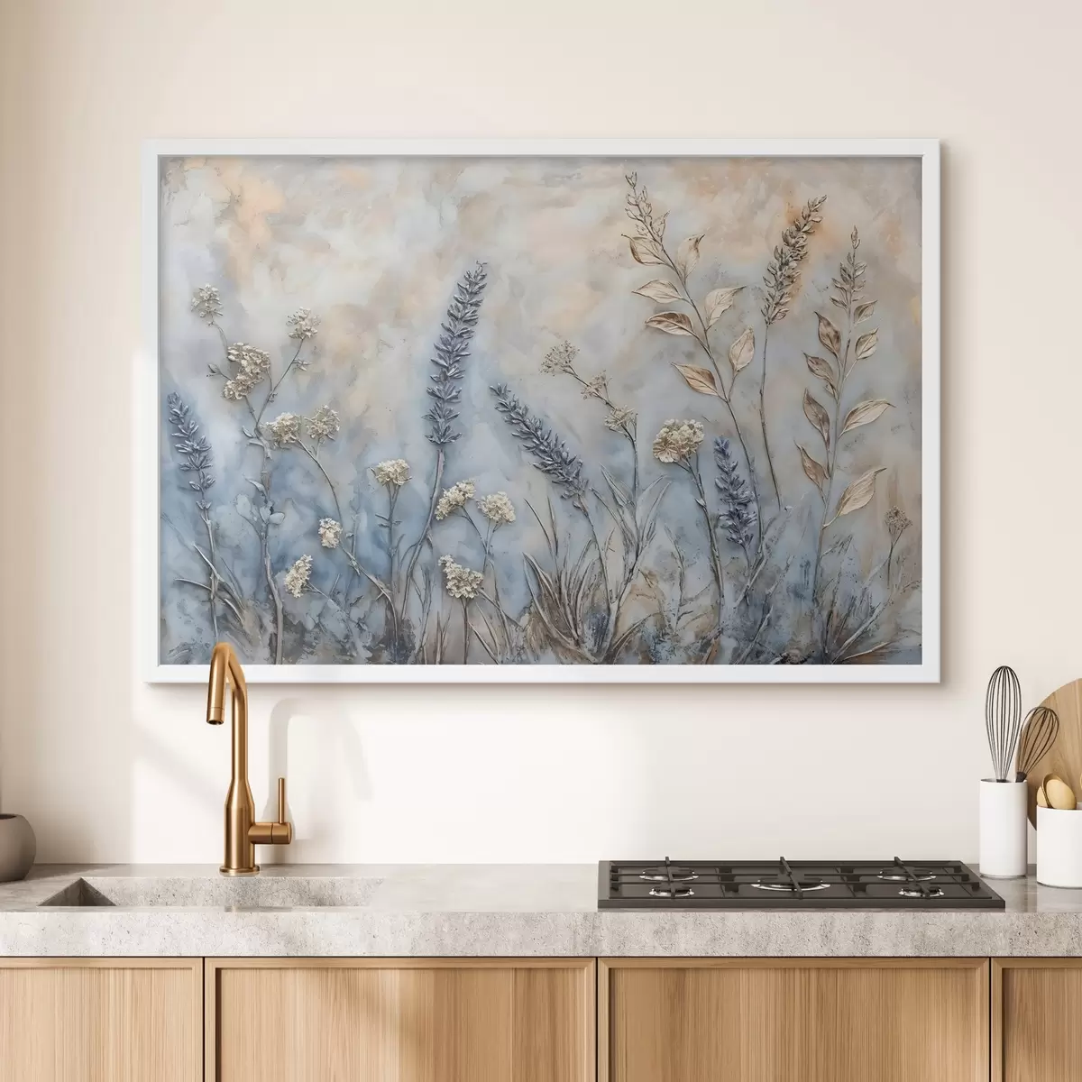 Plakatas Mėlynos, baltos ir smėlio spalvos įvairių laukinių gėlių ir augalų laukas švelniame, miglotame fone f42214