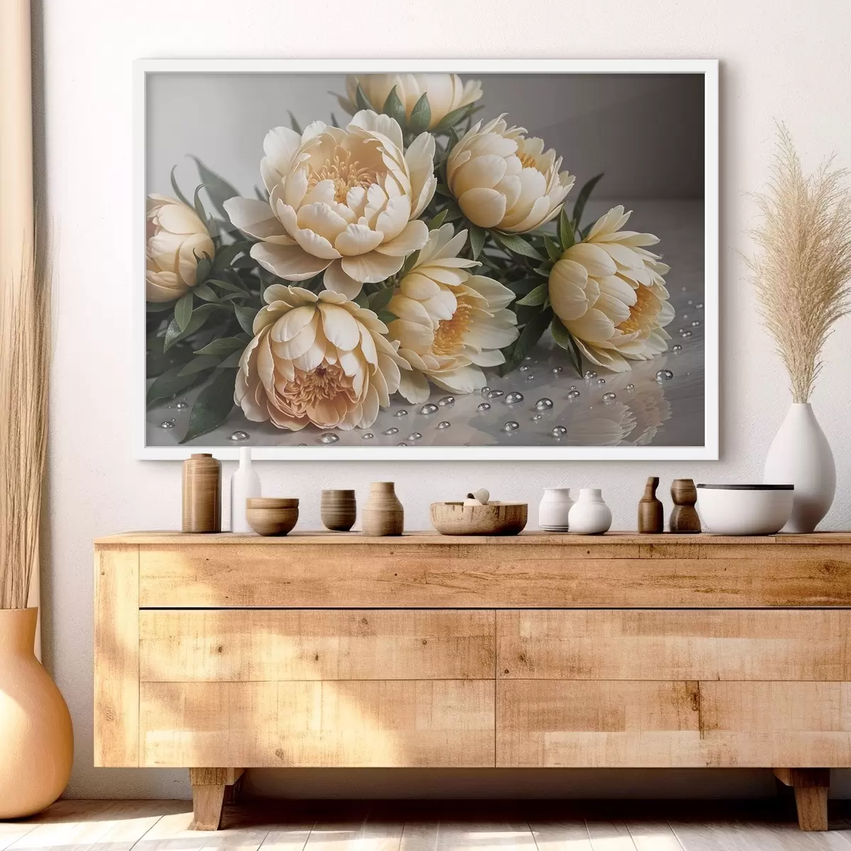 Plakatas Kreminės spalvos detalūs bijūnų žiedai su tamsiai žaliais lapais pilkame fone f42215