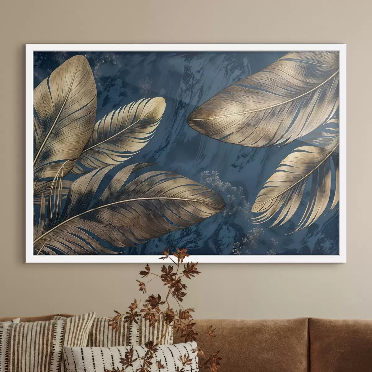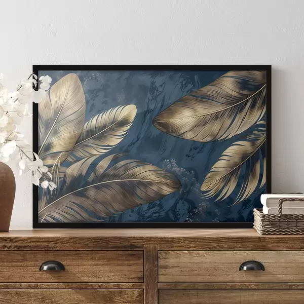 Plakatas Geltonos ir smėlio spalvos abstrakčios dekoratyvinės plunksnos, plūduriuojančios tamsiai mėlyname tekstūriniame fone f42218