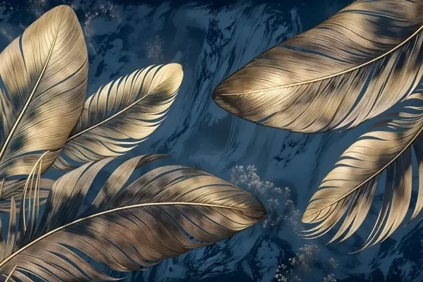 Plakatas Geltonos ir smėlio spalvos abstrakčios dekoratyvinės plunksnos, plūduriuojančios tamsiai mėlyname tekstūriniame fone f42218
