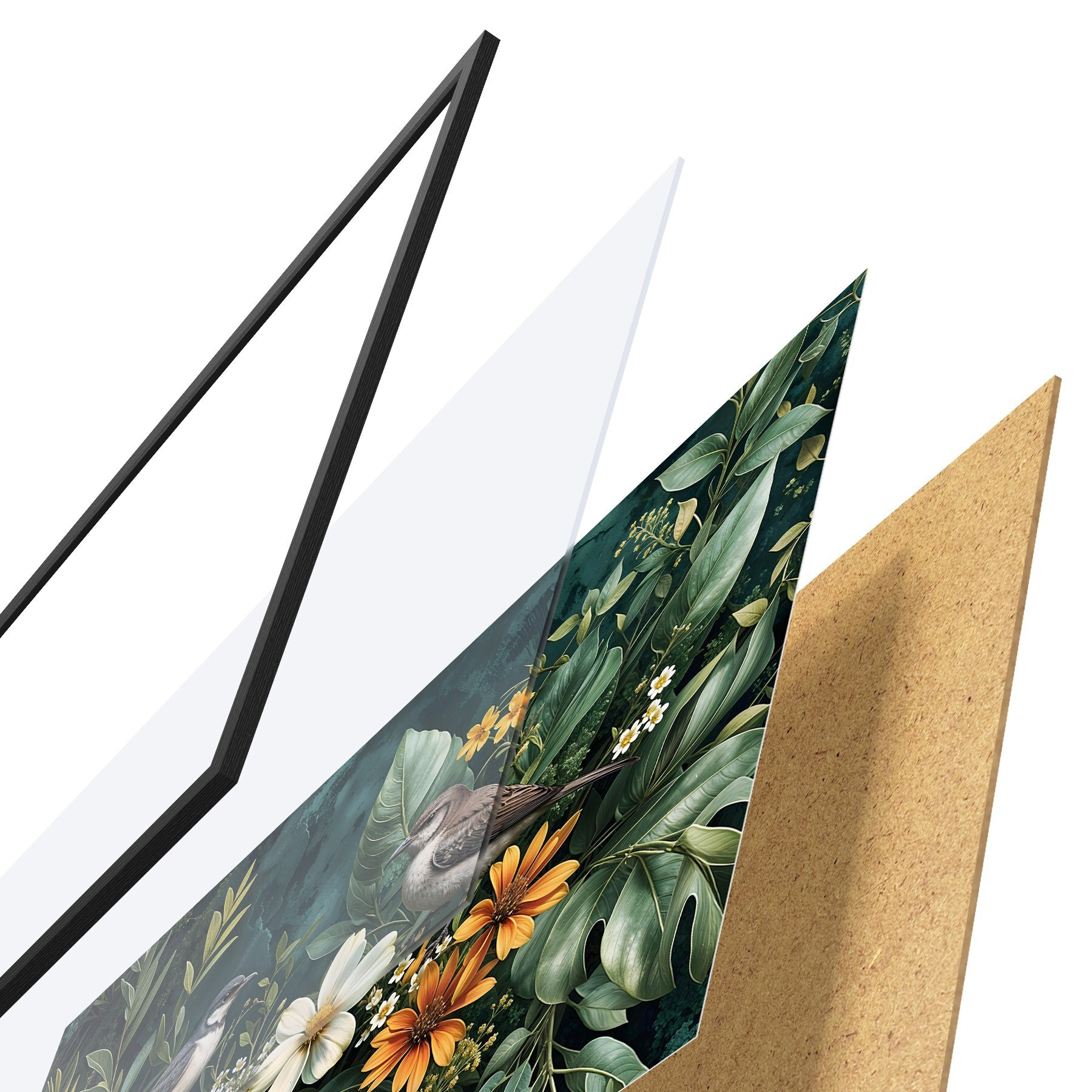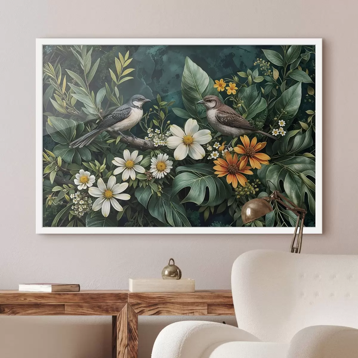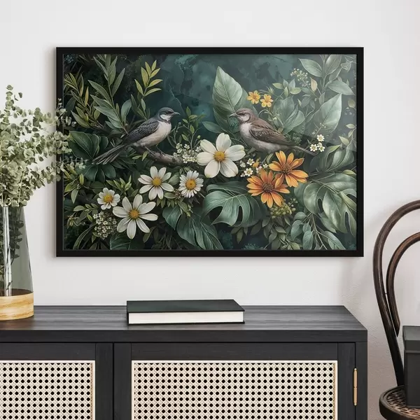 Plakatas Maži paukščiai, įsitaisę ant šakų, apsupti vešlios atogrąžų lapijos, įskaitant didelius žalius lapus ir spalvingas gėles f42220