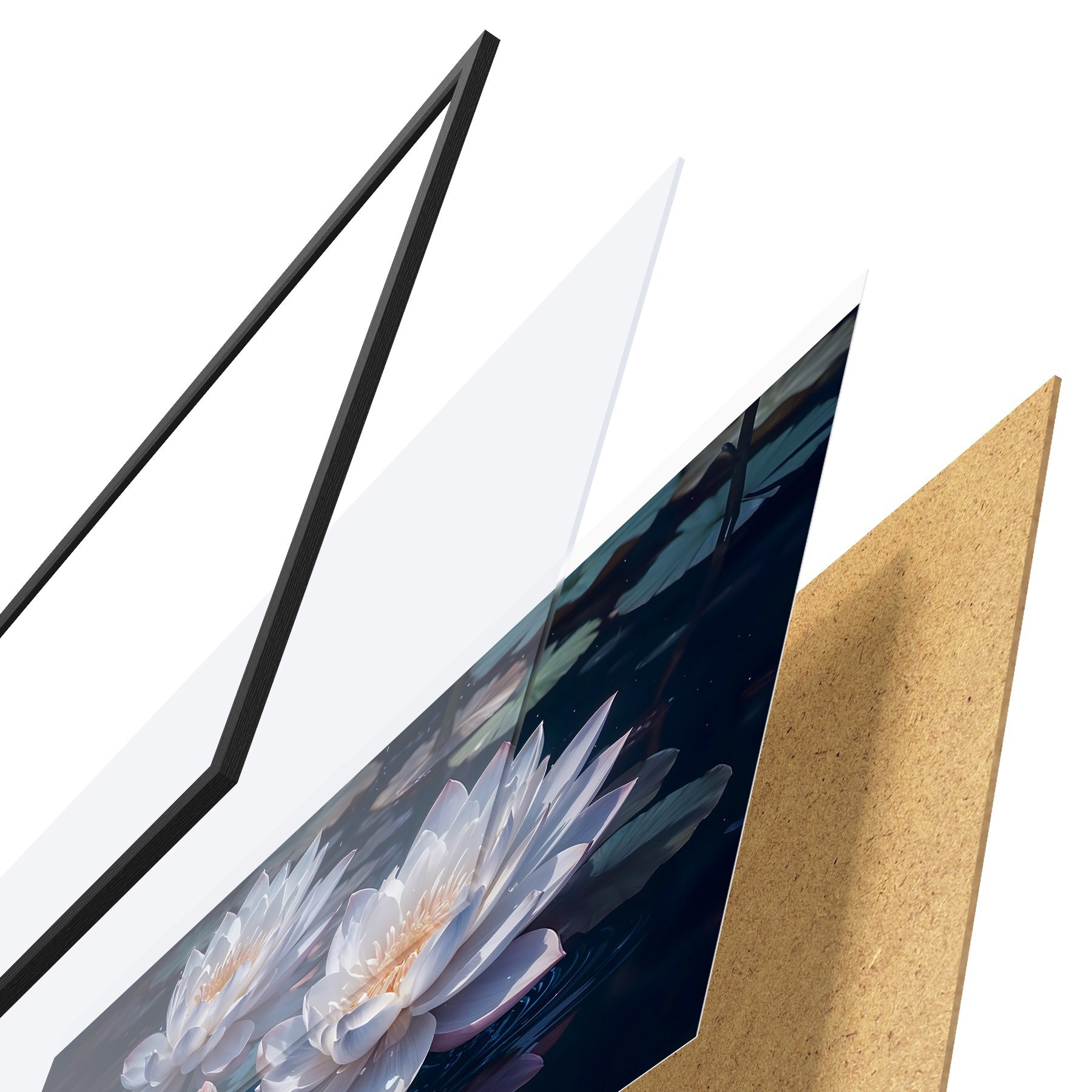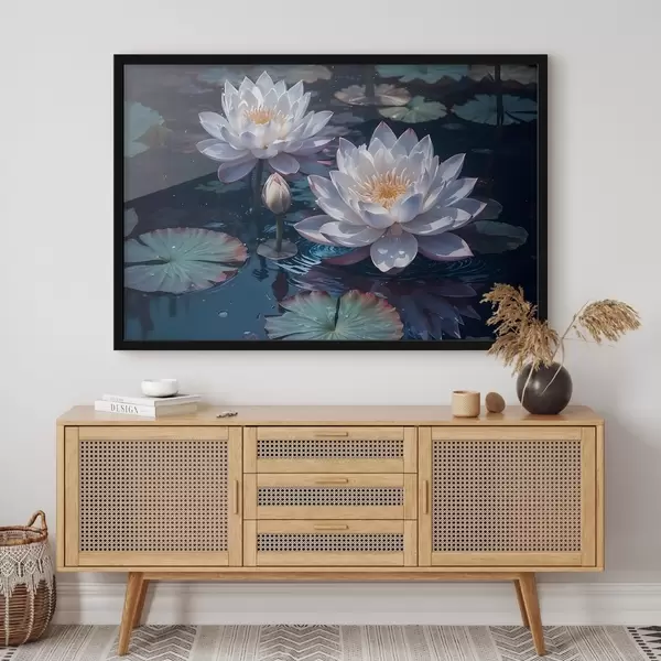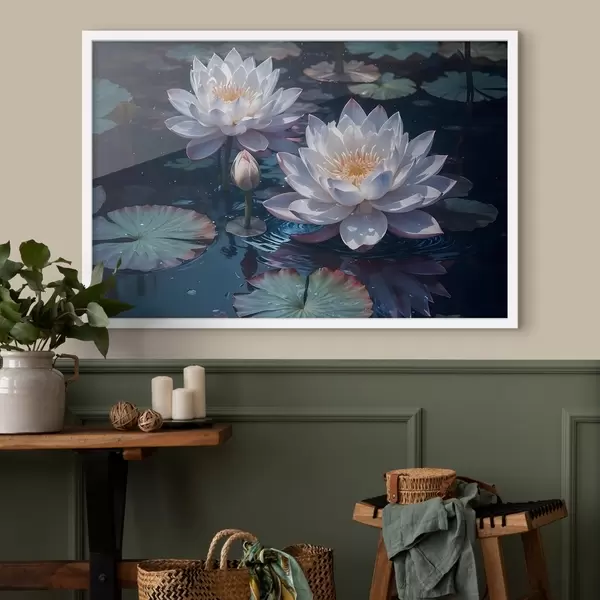 Plakatas Balti lotoso žiedai plūduriuoja ramiame tvenkinyje su lelijų pagalvėlėmis f42225