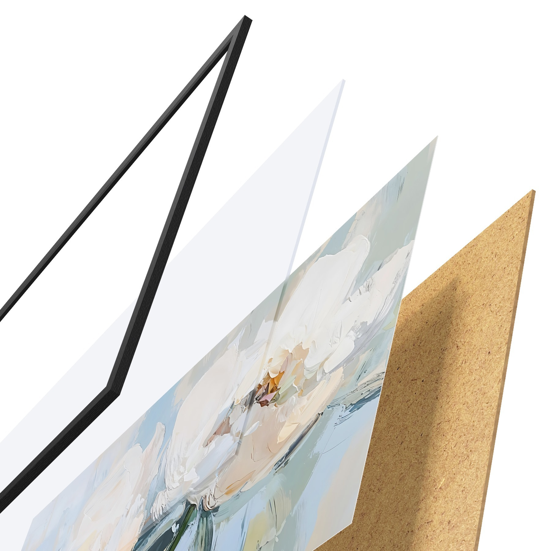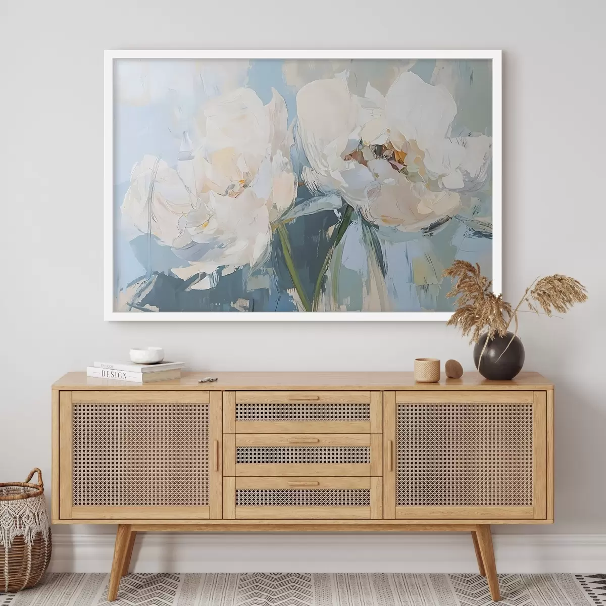 Plakatas Balta minimalistinė abstrakčių bijūnų aliejinės tapybos imitacija minkštame mėlyname fone f42226