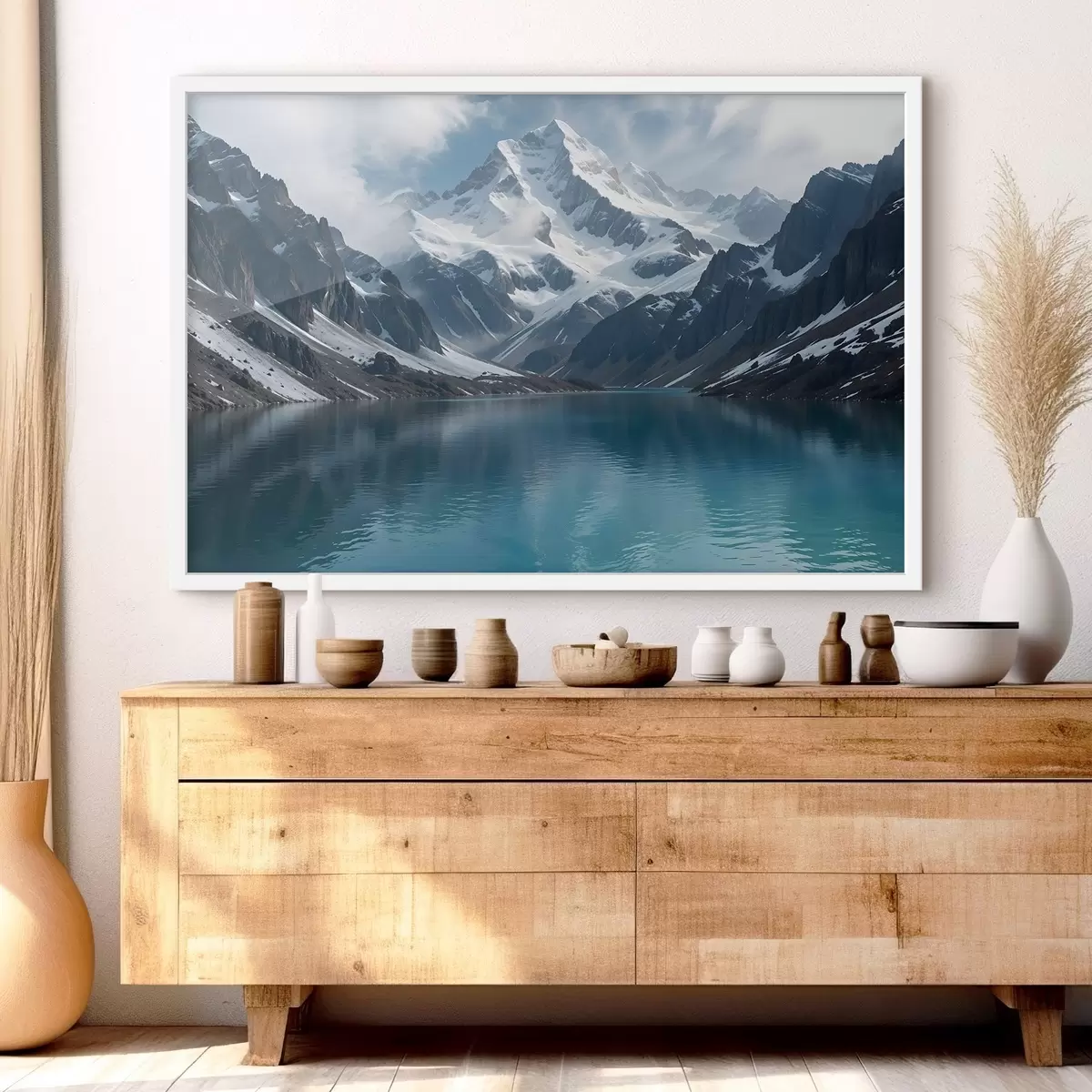 Plakatas Snieguota kalnų viršūnė, atsispindinti ramiame turkio spalvos ežere, apsupta uolėto reljefo ir įspūdingų debesų Ne f42232