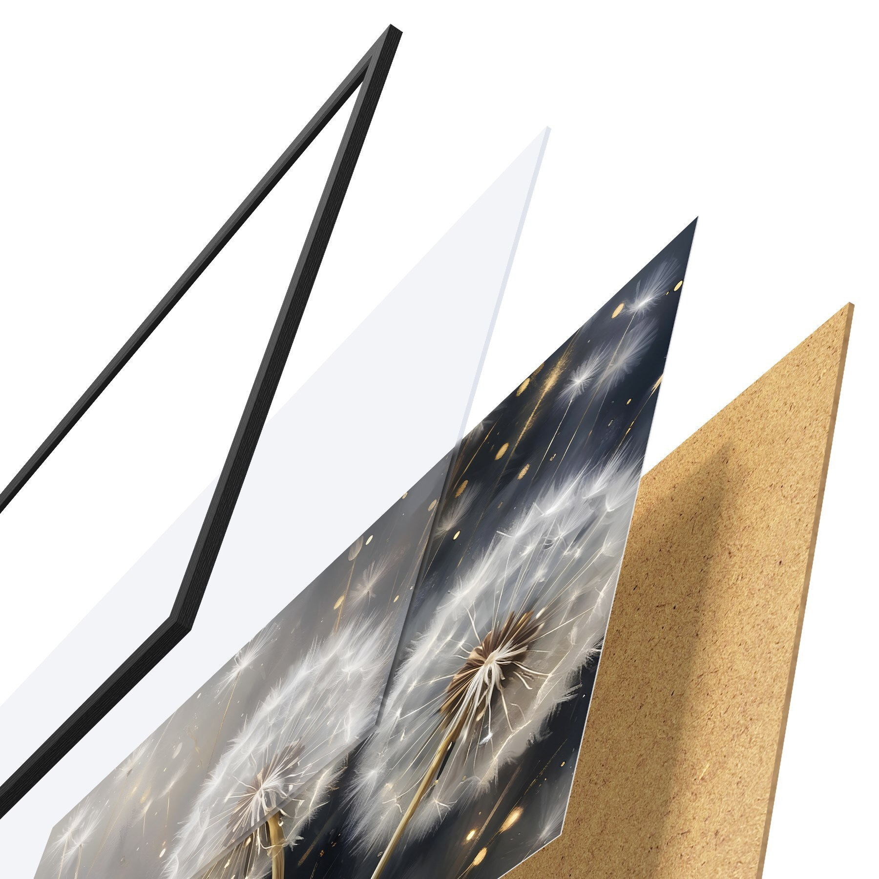 Plakatas Kiaulpienių žiedai su puriomis baltomis sėklų galvutėmis tamsiame fone sukuria magišką atmosferą f42235