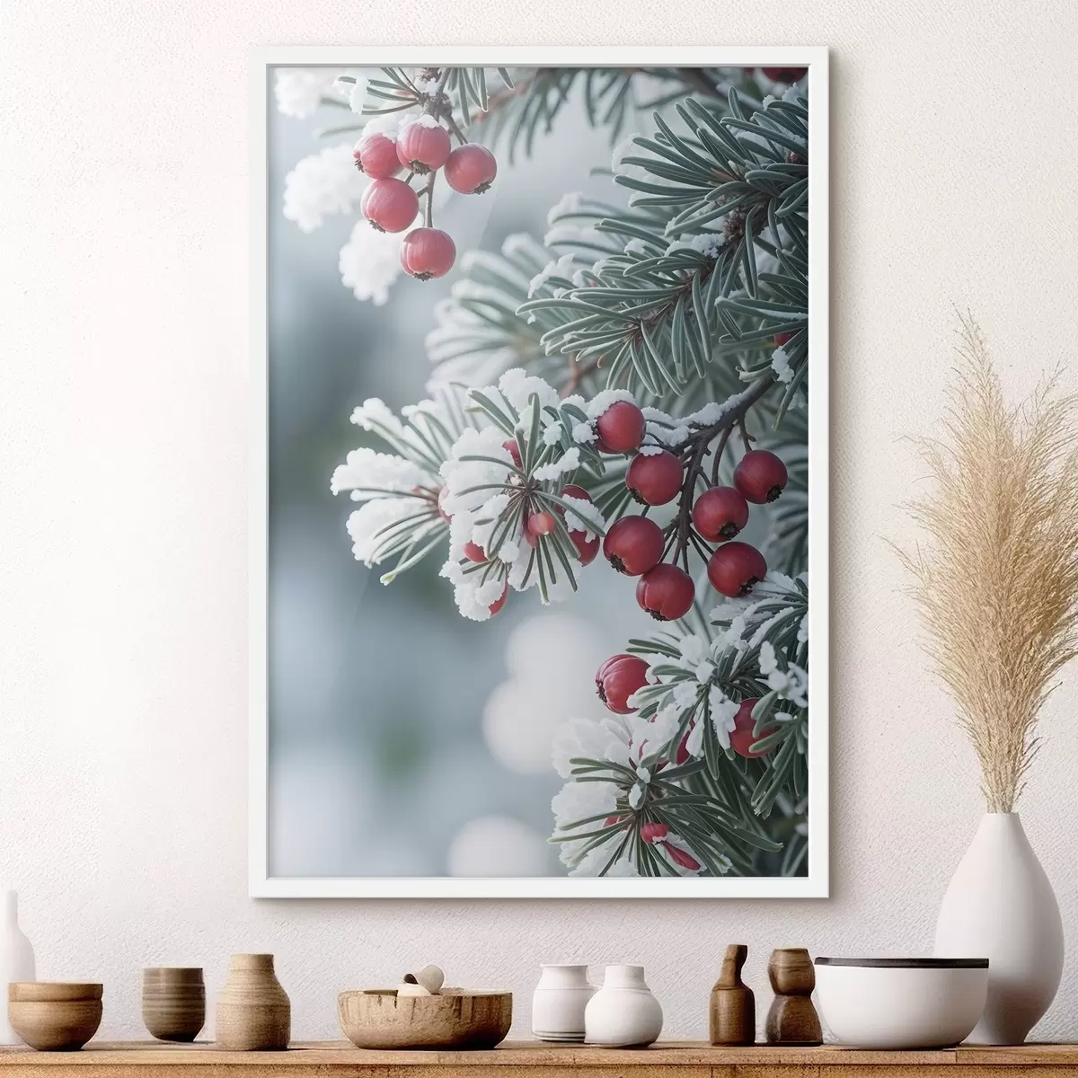 Plakatas Snieguota pušies šaka su raudonomis uogomis , žiemos scena f42238