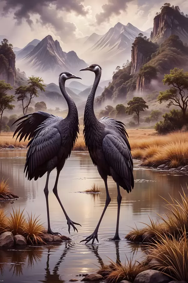 Plakatas Dvi didelės juodos gervės stovi negiliame tvenkinyje, fone - kalnuotas kraštovaizdis f42240