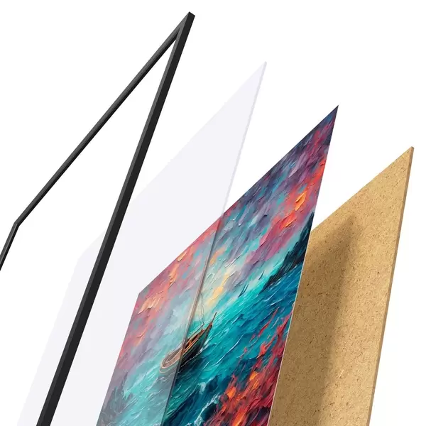 Plakatą sudaro rėmas, pleksiklas, atspausdintas vaizdas ir medžio drožlių plokštės pagrindas. Plakatą galima iš karto pakabinti ant sienos dėl kitoje pusėje esančių laikiklių.