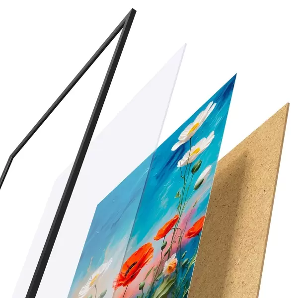 Plakatą sudaro rėmas, pleksiklas, atspausdintas vaizdas ir medžio drožlių plokštės pagrindas. Plakatą galima iš karto pakabinti ant sienos dėl kitoje pusėje esančių laikiklių.