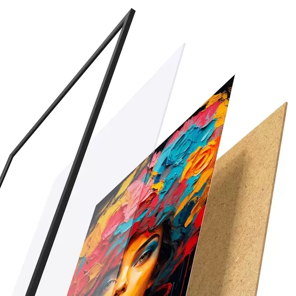 Plakatą sudaro rėmas, pleksiklas, atspausdintas vaizdas ir medžio drožlių plokštės pagrindas. Plakatą galima iš karto pakabinti ant sienos dėl kitoje pusėje esančių laikiklių.